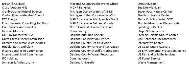 2018 Clinton River Water Festival Sponsors and supporters include Pure Oakland Water, Waste Management, Oakland University, Oakland County Water Resources Commissioners Office, Clinton River Watershed Council, Cranbrook Science Institute, and the City of Auburn Hills.