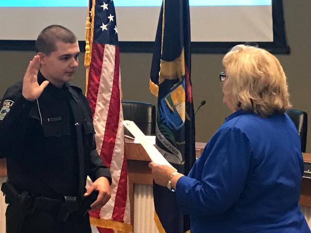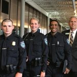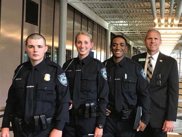 From left to right: Officer Dillon Morgan, Officer Cynthia Wagner, Officer Kelsey Brown, City Manager Tom Tanghe