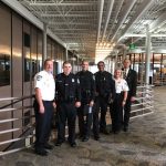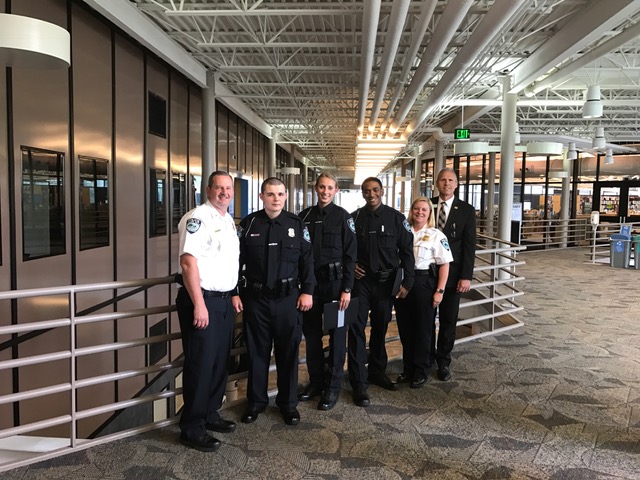 From left to right: Lt. Cas Miarka, Officer Dillon Morgan, Officer Cynthia Wagner, Officer Kelsey Brown, Lt. Jill McDonnell, City Manager Tom Tanghe