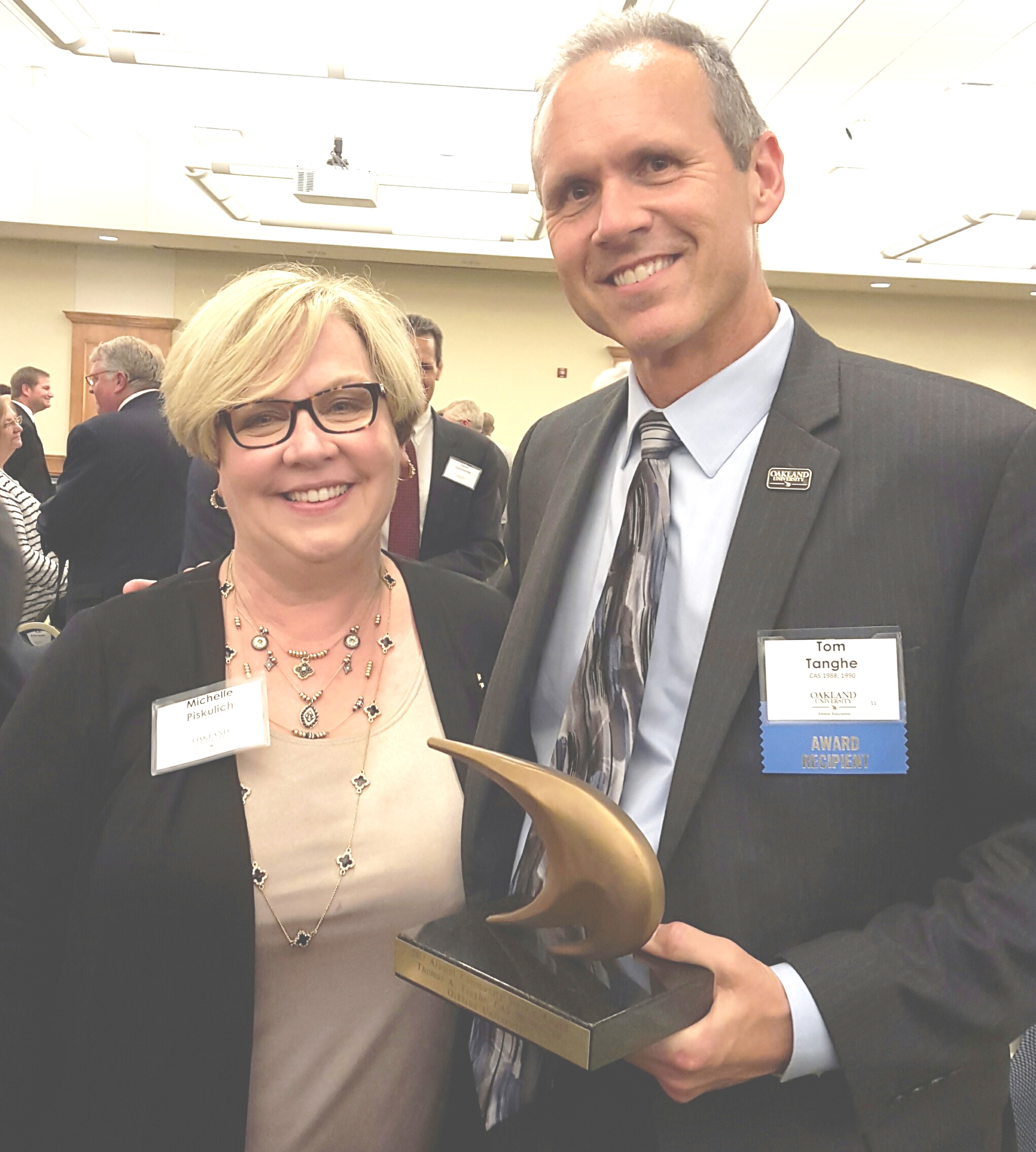 Last Friday night, Auburn Hills City Manager Tom Tanghe was honored with an award for his exceptional commitment to the University with the Alumni Community Service Award. He’s a regular volunteer at events such as Go For the Gold, commencement ceremonies, convocation and serves as an ambassador to the College of Arts and Sciences. He jokes that he’s on campus so often with events and meetings, that he should have an office on campus.