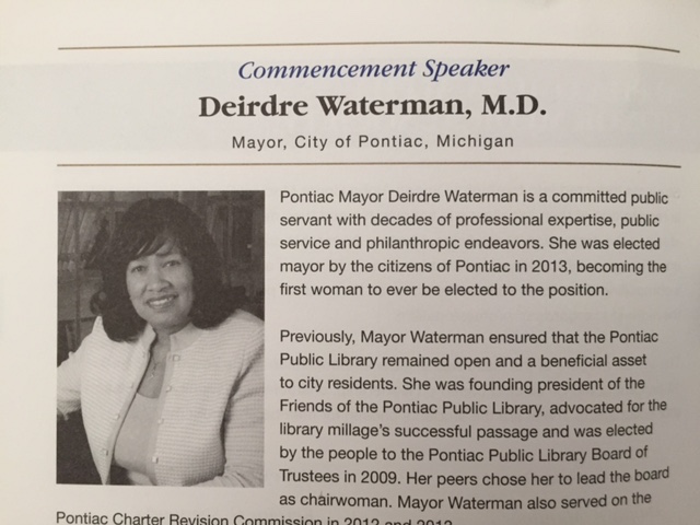 On Friday afternoon, May 13, 2016, I had the privilege of attending the Oakland University William Beaumont Medical School Graduation Ceremony. There was certainly nothing unlucky about this Friday the 13th, including the Michigan weather. The second graduating class took to the stage while family, friends, university staff and administrators, community members, and dozens of other medical school students looked on as we watched these graduates become medical doctors. As an observer, you could see the great pride as Dr. Robert Folberg, Founding Dean of the medical school, shakes the hands of each of his graduates as they receive their diplomas. And for those where medicine runs in the family, there were parents and siblings who are also doctors and assisted in the hooding of their graduate. But among the many highlights of this very exciting day was the delivery of the keynote address by commencement speaker Deirdre Waterman. As a friend and colleague, I was fascinated to learn that Deirdre, actually Dr. Deirdre Waterman, holds the distinction of being the first African-American ophthalmologist in Michigan. But among her many accomplishments as a highly skilled physician, she is also the Mayor of the City of Pontiac. How is this for a title: The Honorable Dr. Deirdre Waterman, M.D. Well, she’s much more humble and is completely happy with just Deirdre, but to me, she’s pretty amazing to have spent an entire career as an ophthalmologist and now as a Mayor and deserves the respect for her incredible achievements.