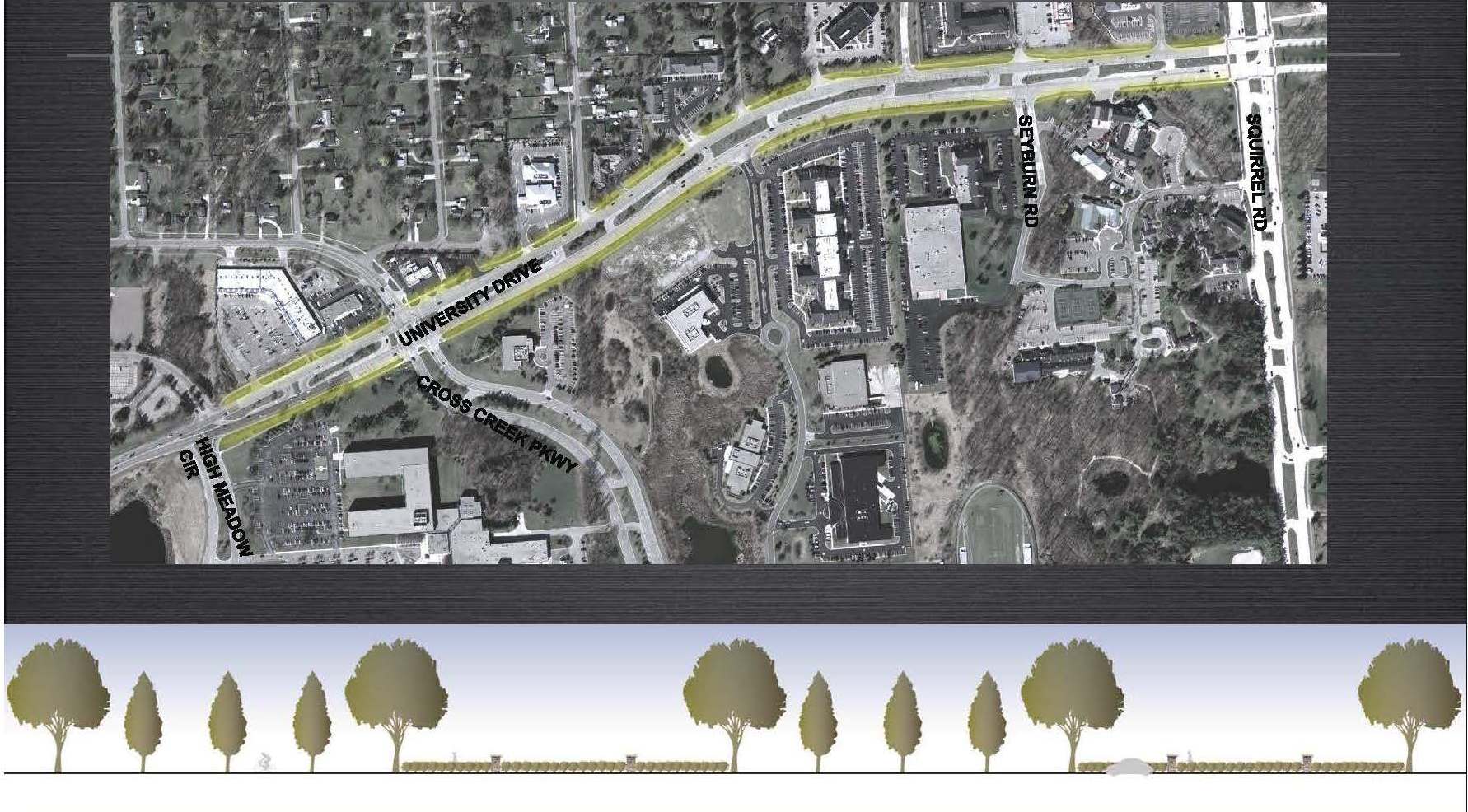 The project began in 2013 with the painting of the existing street light poles along University Drive black and the purchase and installation of new University and City banners. The remaining improvements will include three monuments in the center boulevard with accent planting beds, decorative stone columns along both sides of the road, street tree installation, and ornamental plantings.