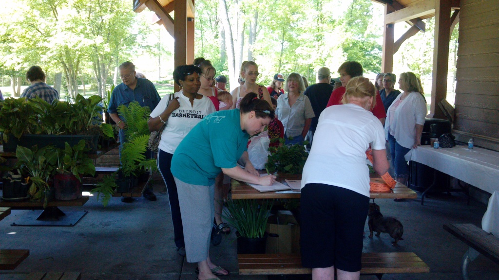 Under the pavilion in River Woods Park, it is estimated that over 80 of our green-thumbed friends traded different varieties of perennial plants, shared gardening tips, and enjoyed listening to guest speaker and gardening expert – Linda Lapinski.  We are very appreciative that Ms. Lapinski generously donated her time to present information on native plant species in Michigan and answer gardening questions.  She was a big hit!