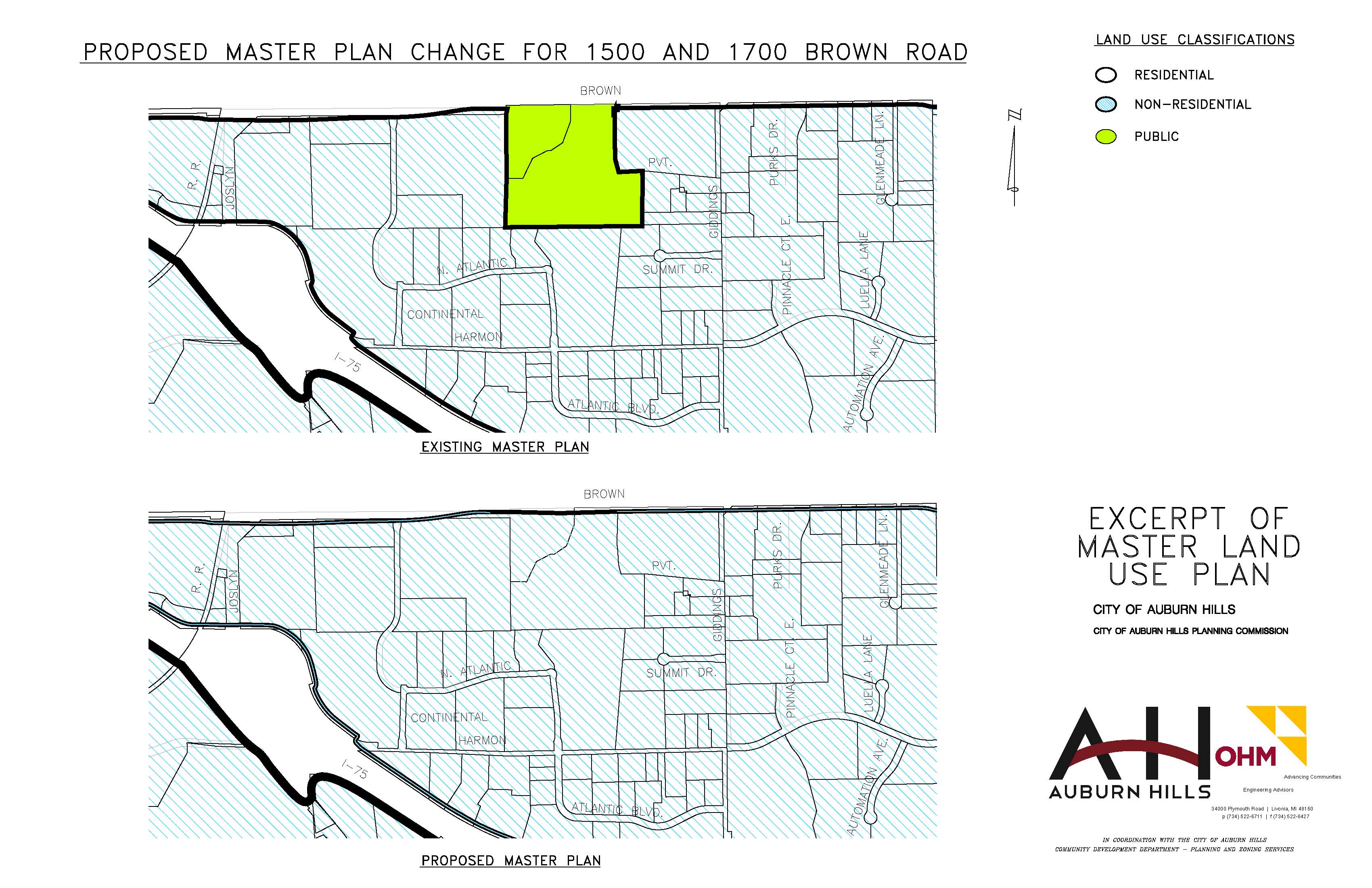 The City Council authorized the Planning Commission’s draft plan to amend the land use classification for both 1500 Brown (City DPW Facility) and 1700 Brown Road this past Monday. The Council’s action will allow the proposed change to be distributed to adjacent governmental agencies, utilities, and Oakland County for review and comment as required per State law. The plan amendment is consistent with the land use classifications of surrounding properties in both the City of Auburn Hills and Orion Charter Township.