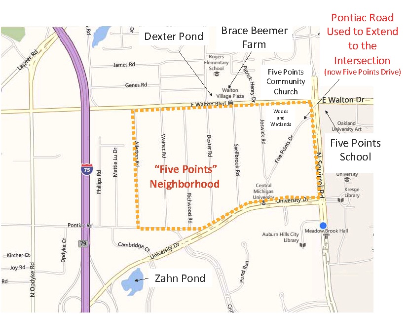 Yesterday, I had the pleasure to meet with two women, Pat Kleindl and Phyllis Leo, who grew up in “Five Points” over 70 years ago.  Their small neighborhood, which initially included six streets from Allerton east to Joswick (f.k.a., Joyce) on the south side of Walton Boulevard, was named after the unusual intersection where Pontiac Road, Squirrel Road, and Walton Boulevard once converged to form five points of land.